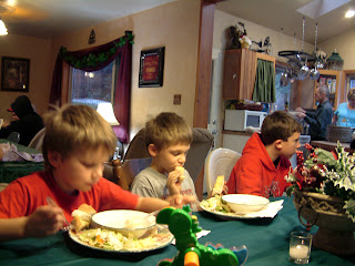 Kenny spent most of the day playing with the new trucks that Santa brought him. However at one point he snapped to attention while eating his salad, to inform me that Santa has magic dust he uses so he can get down the chimney. This picture was taken toward the end of the day and all the children were beginning to droop. So were the rest of us for that matter.